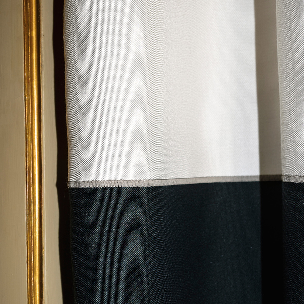 Tessuto Dedar. Tenda continua con balza che origina da due tagli dell’unito Boston in colori a contrasto, uniti tramite un sottile ricamo. E’ ignifuga, lavabile, di facile uso e manutenzione. In grande altezza, è proposta in 3 varianti bicolori.