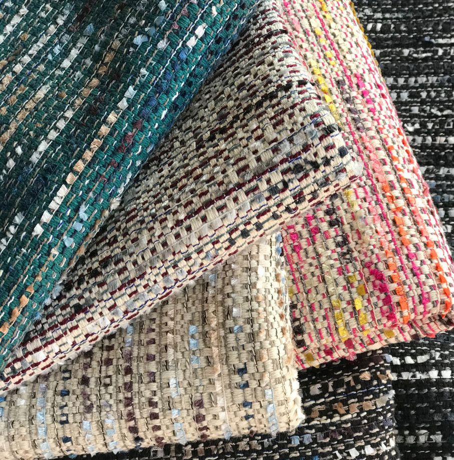 Tessuto Osborne & Little. Un disegno a canestro intrecciato con filati tufted multicolori.