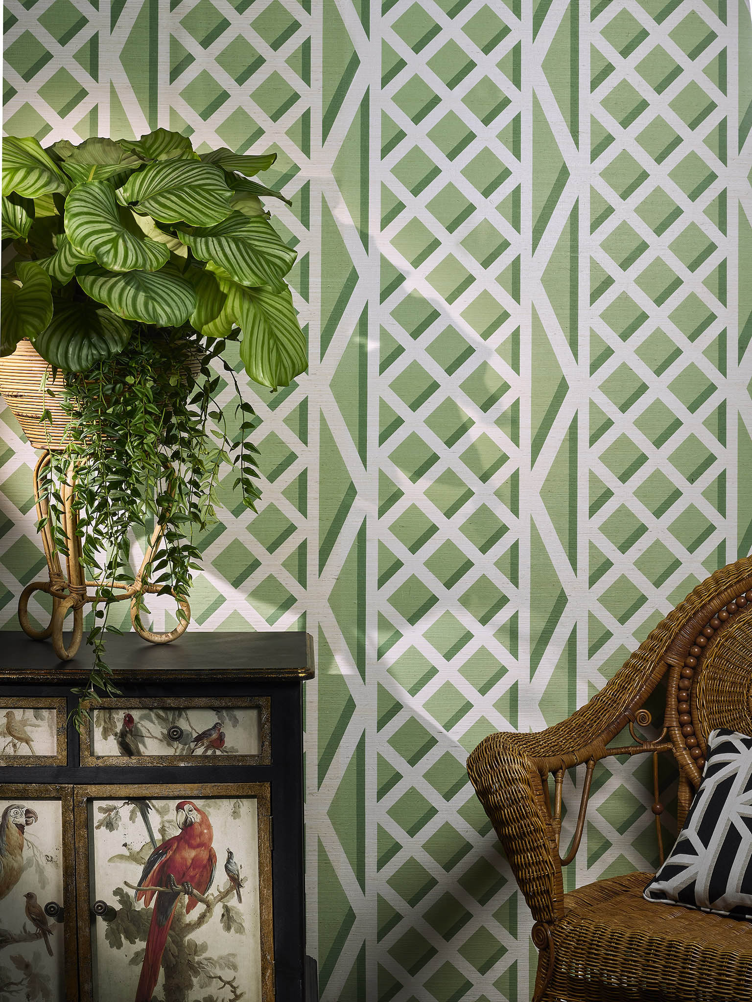 La stampa digitale su fondo in rafia artigianale dona un aspetto autentico al disegno sottolineato da colori allegri.